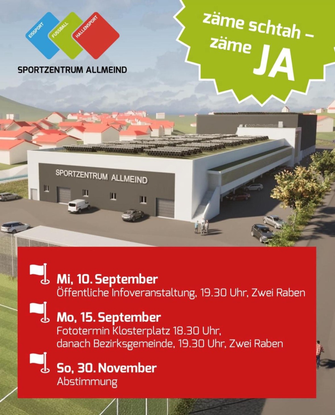 Wie du sicher schon mitbekommen hast, steht am 30. November die entscheidende Abstimmung zum Sportzentrum Allmeind bevor.